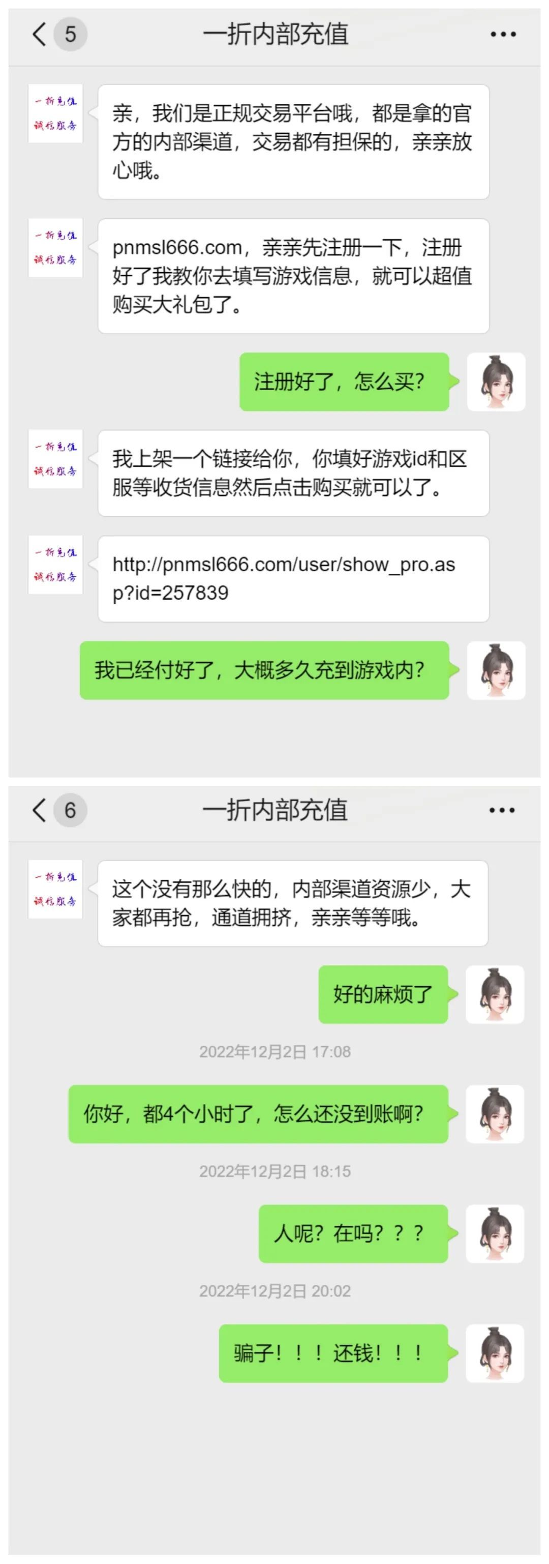 骗 术 1 ——低 价 充 值近期不少仙主大人反馈,游戏内有不法分子冒充玩家或官方客服,利用低价充值折扣、大量赠送游戏内道具和礼包等噱头实施诈骗,或直接在游戏世界频道内发布代充广告等违规信息,并以此为借口要求玩家直接、或通过诈骗平台间接提供:账号密码、身份信息、银行卡等信息等,或者直接发送红包和转账来实施诈骗。