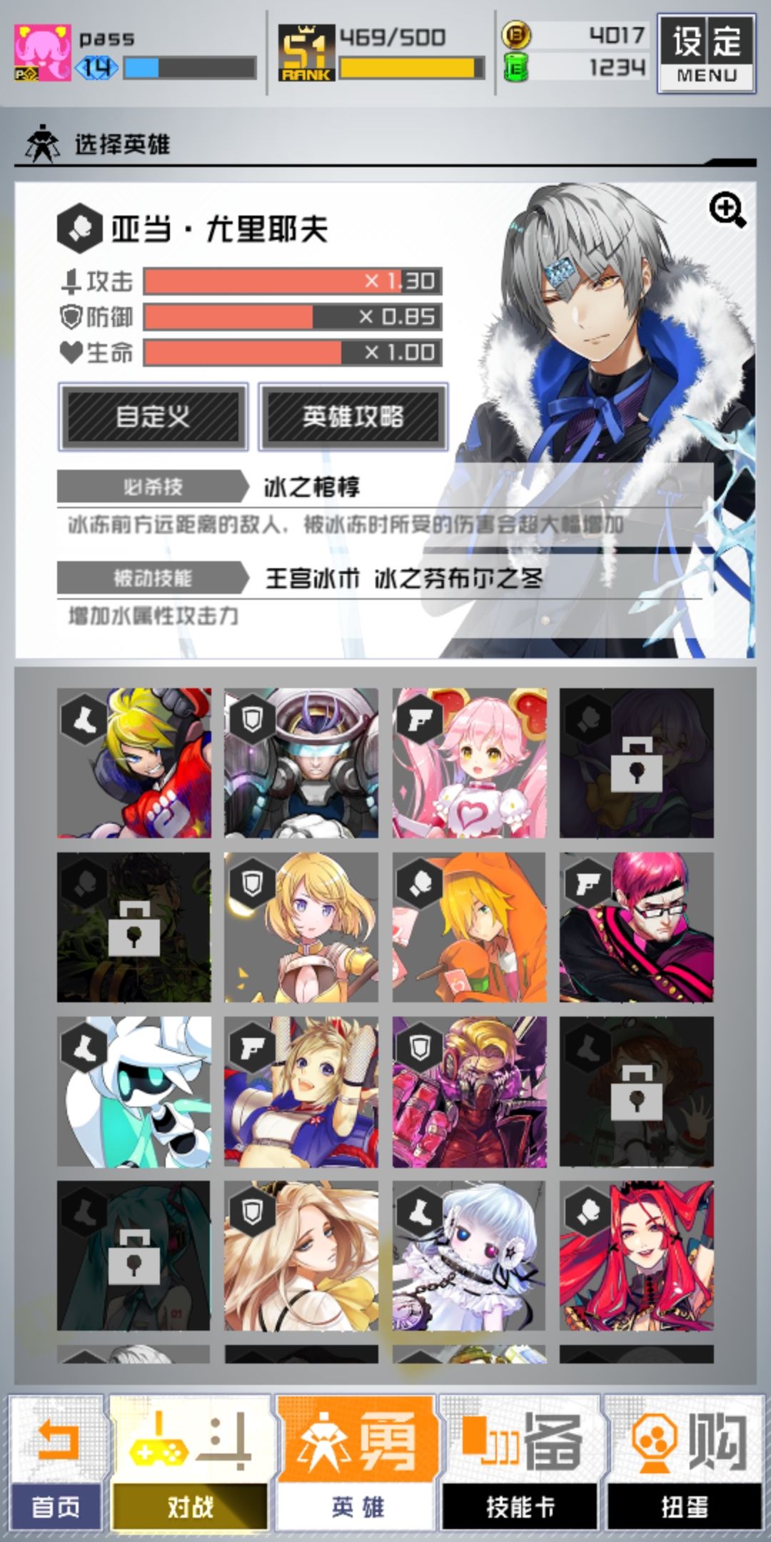 亚当是我最常用,也是最拿手的,远程的一个蓄力怼过去(没有远程卡的补救),近战,要么一个防加一个SR的近战卡,就是一个加攻卡,一个防卡,慢慢怼。