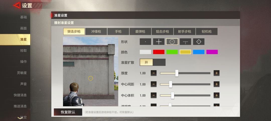 【3】准星设置(图4)7种枪械每个都可以单独设置,这里我推荐开这个圆圈,颜色选择鲜艳的红色黄色等都可以看个人喜好。推荐开启准星扩散是这样可以得到一定的视觉反馈,可以让你知道当前弹道扩散范围。