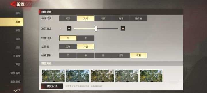【2】画面设置(图3)画面品质开哪一档都没关系,我本人用的是骁龙870手机,这样设置还挺流畅也不是很发烫;最重要的是!!帧数!!必须拉到最高,开启极限,这样对局更加顺畅。抗锯齿打开,游戏画质略微降低,没那么发烫耗电。画面风格我个人开的是鲜艳,更好看清地图里的对手。
