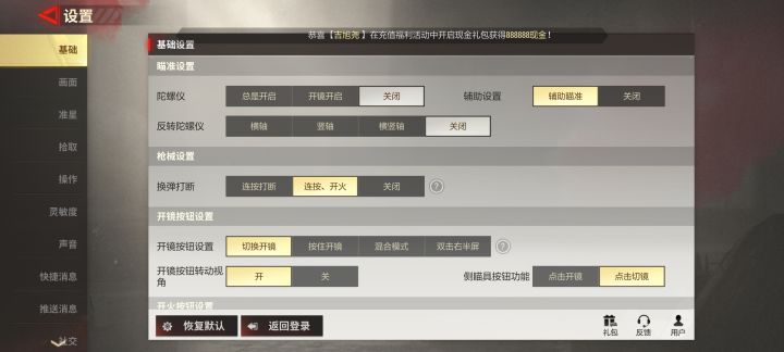 【1】基础设置(图2)—陀螺仪这个功能比较鸡肋可以不开(我个人认为游戏里晃动手机影响游戏对局体验);辅助瞄准推荐大家开启;换弹打断调整到连按开火,这样敌人来了也不会在那傻傻的换弹。