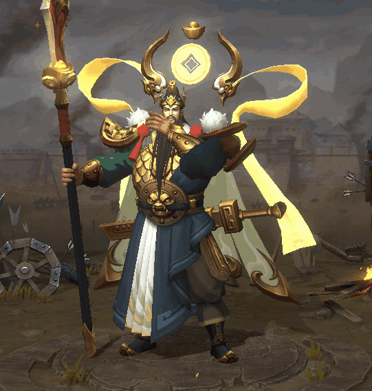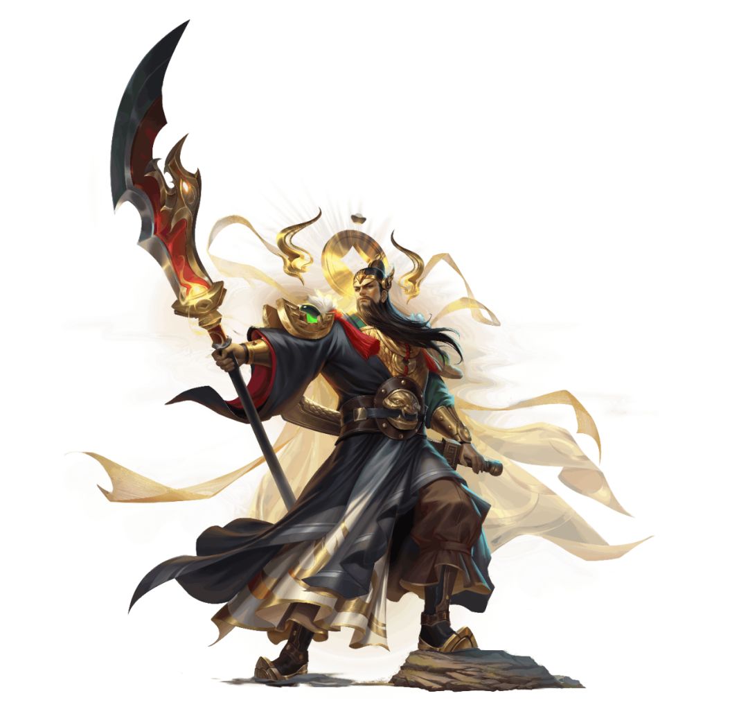 《历代神仙通鉴》中记载了关公生前乃解梁老龙的传说,是关羽被后世尊为武财神的起源之一,因此本次神话系列换装直接参考传说进行设计,采用青龙偃月刀、金玉之物等元素,彰显其“司武掌财”的职能,服装剪裁和配色则是参考民间常见的武财神像,力求还原其形象特征。