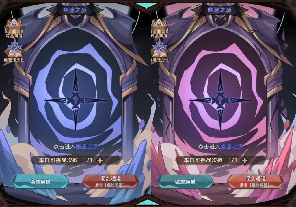 【幽邃之源】每日限定挑战1次,并且在游戏界面会提供2种不同难度的挑战方式。