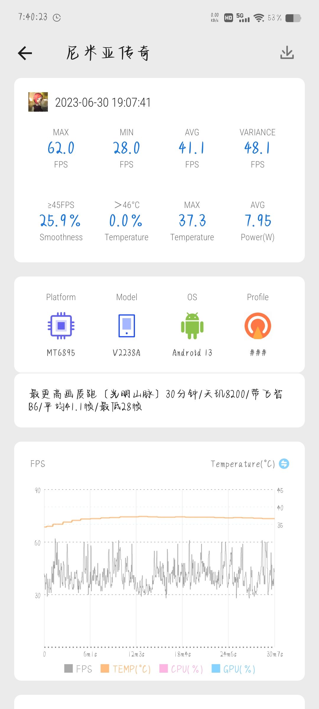 画质全部拉最更高,分辨率也拉到最更高,天玑8200在最更高画质下平均41.1帧率,飞智B6压机身温度有点够呛,差点压不住