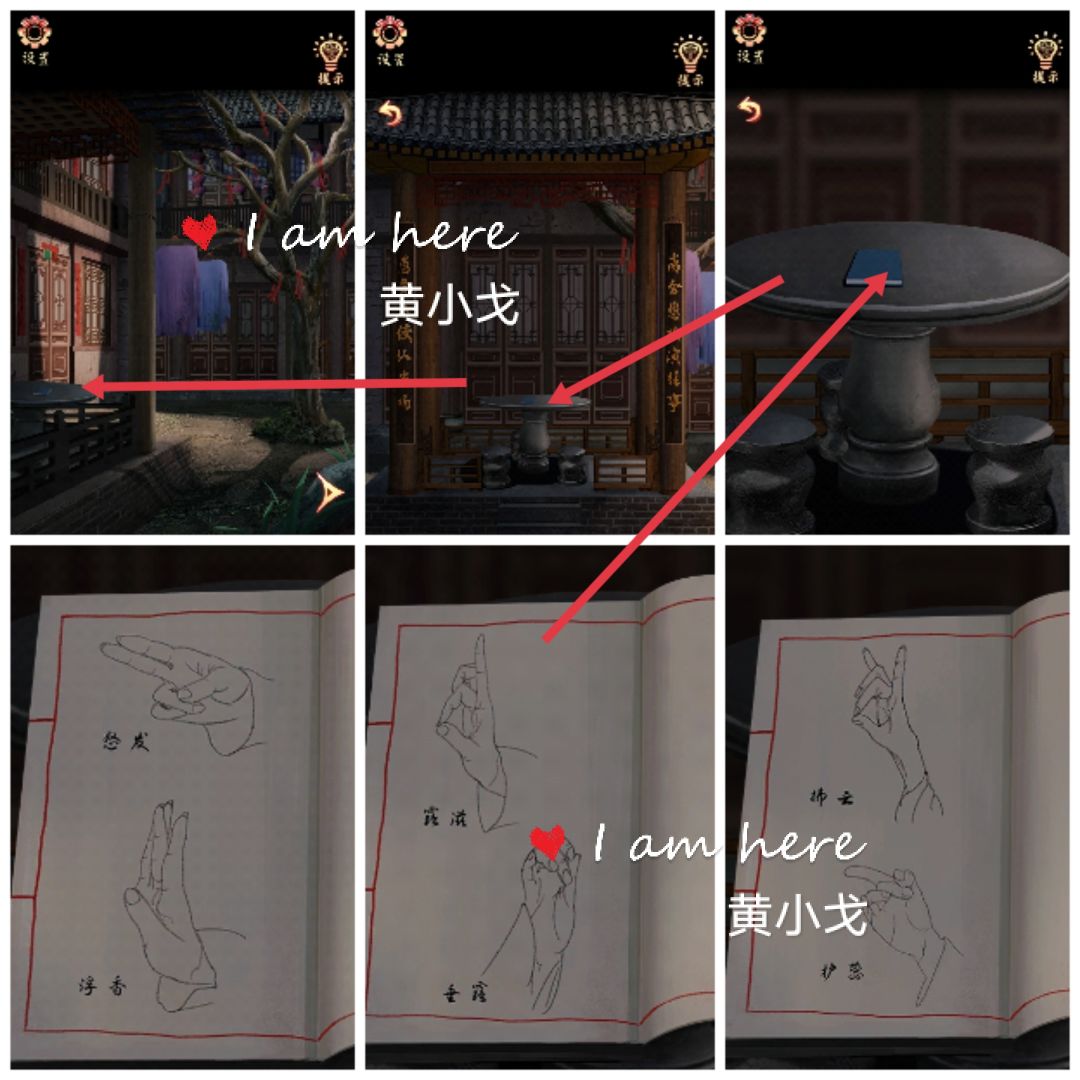 14.(院子-左)点击房间门上的密码锁,根据书上的手势线索和灯笼上的文字顺序(拂云、垂露、怒发、浮香),转动图案至正确位置,打开房门