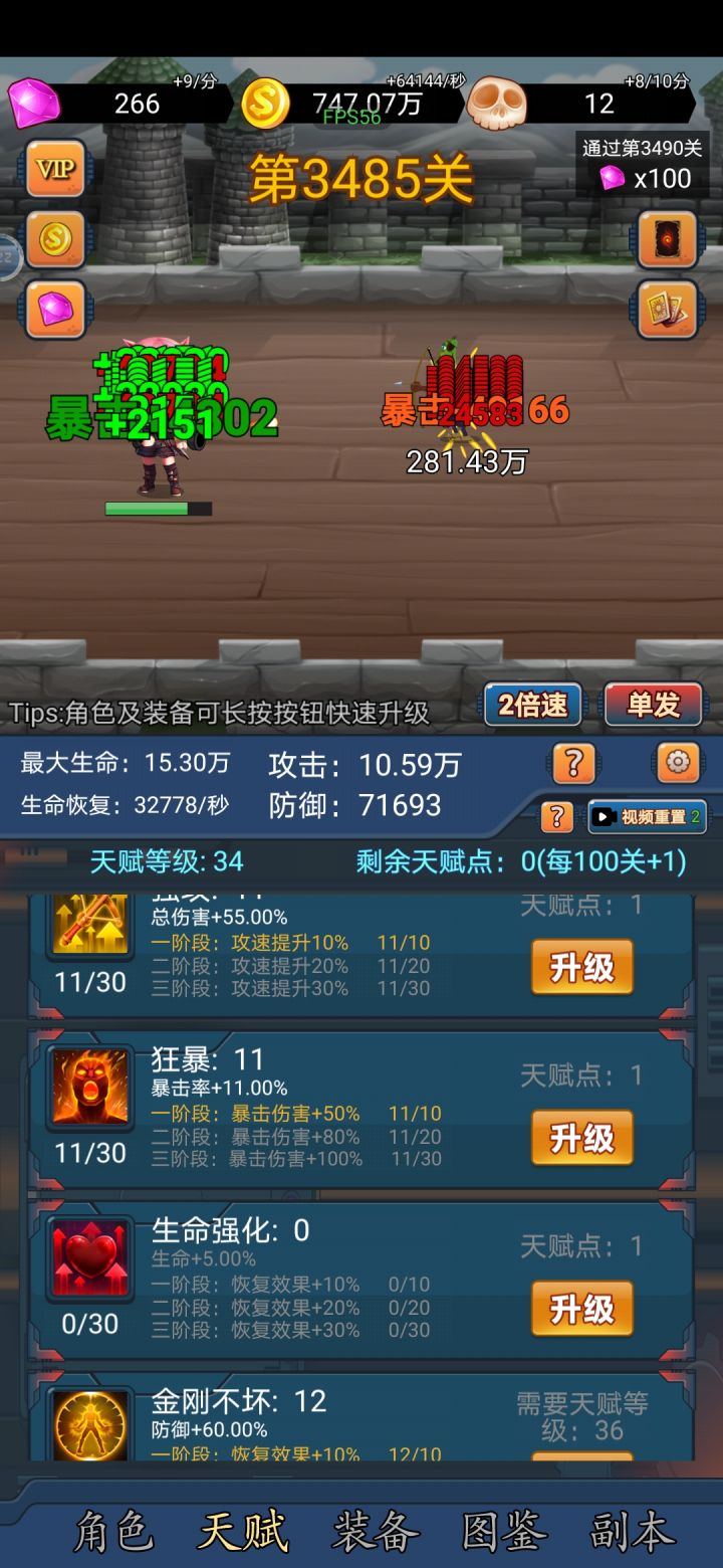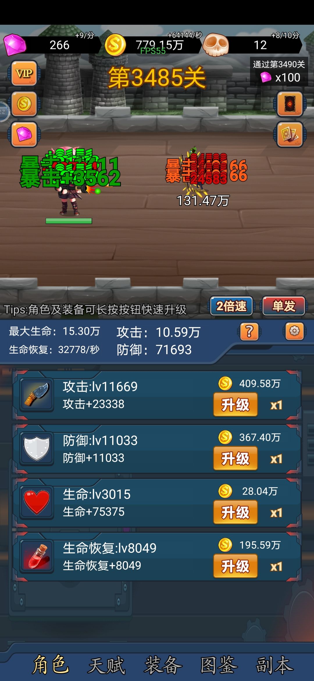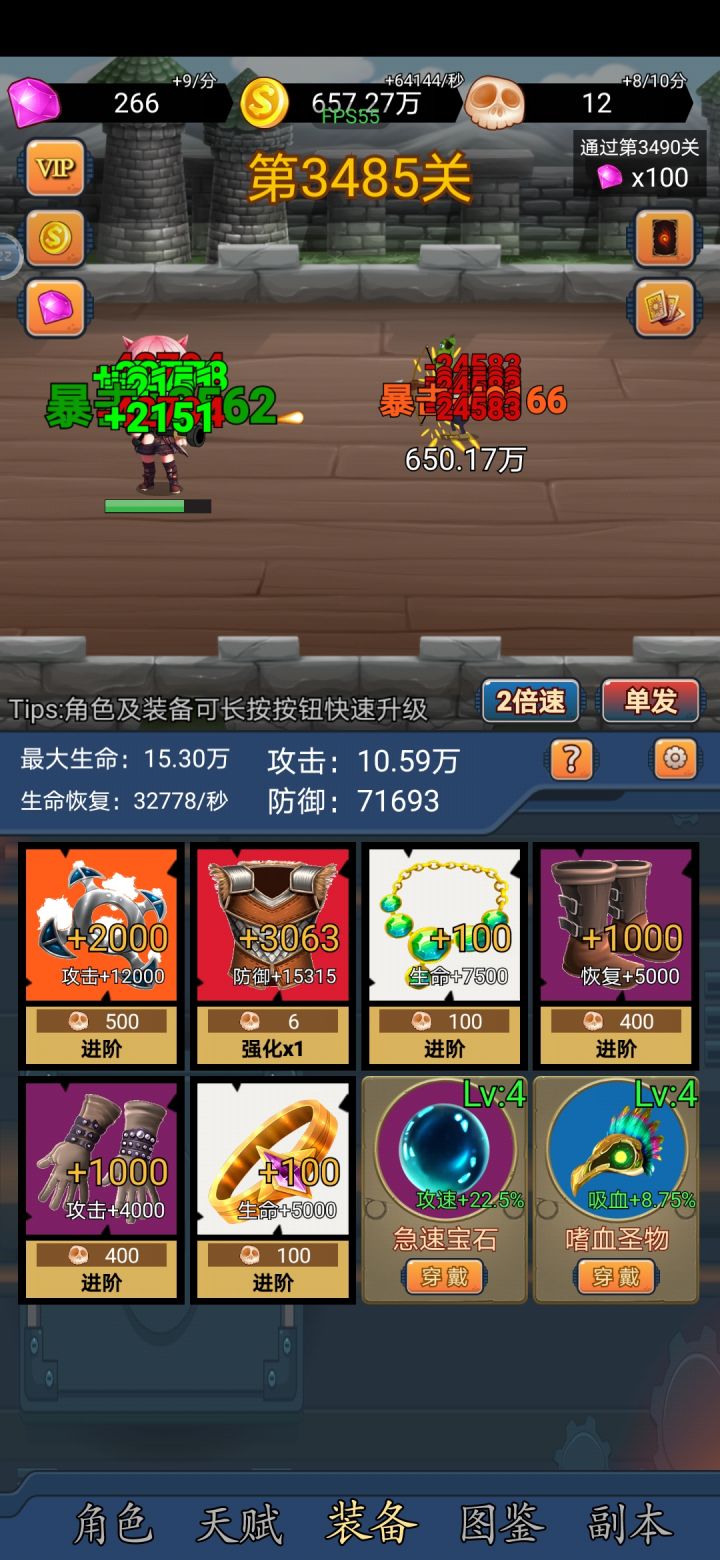 3485关了,主防御,副攻击,在生命恢复,生命值不是很重要,遇到五个攻击低一点的扛着就能过关,神器,攻速与暴击是叠成关系,所以用攻速神器,等到爆伤倍率高了可以换爆伤神器把,吸血必带。