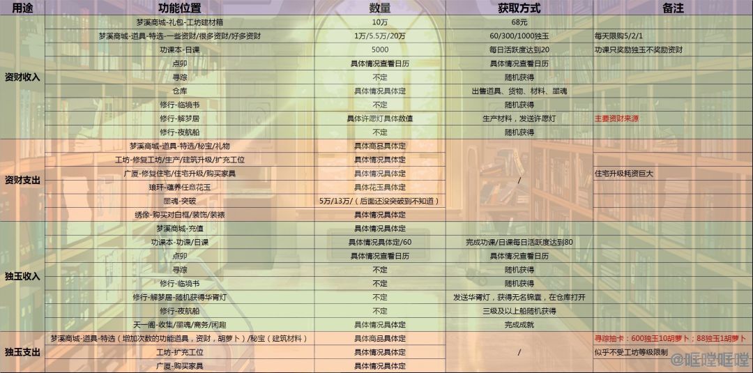 •独玉应该还有些其他用处,比如刷新许愿灯、增加放灯次数、商店刷新等等,因为比较零碎(导出了图才想起来懒得改了)所以就没有出现在表格里
