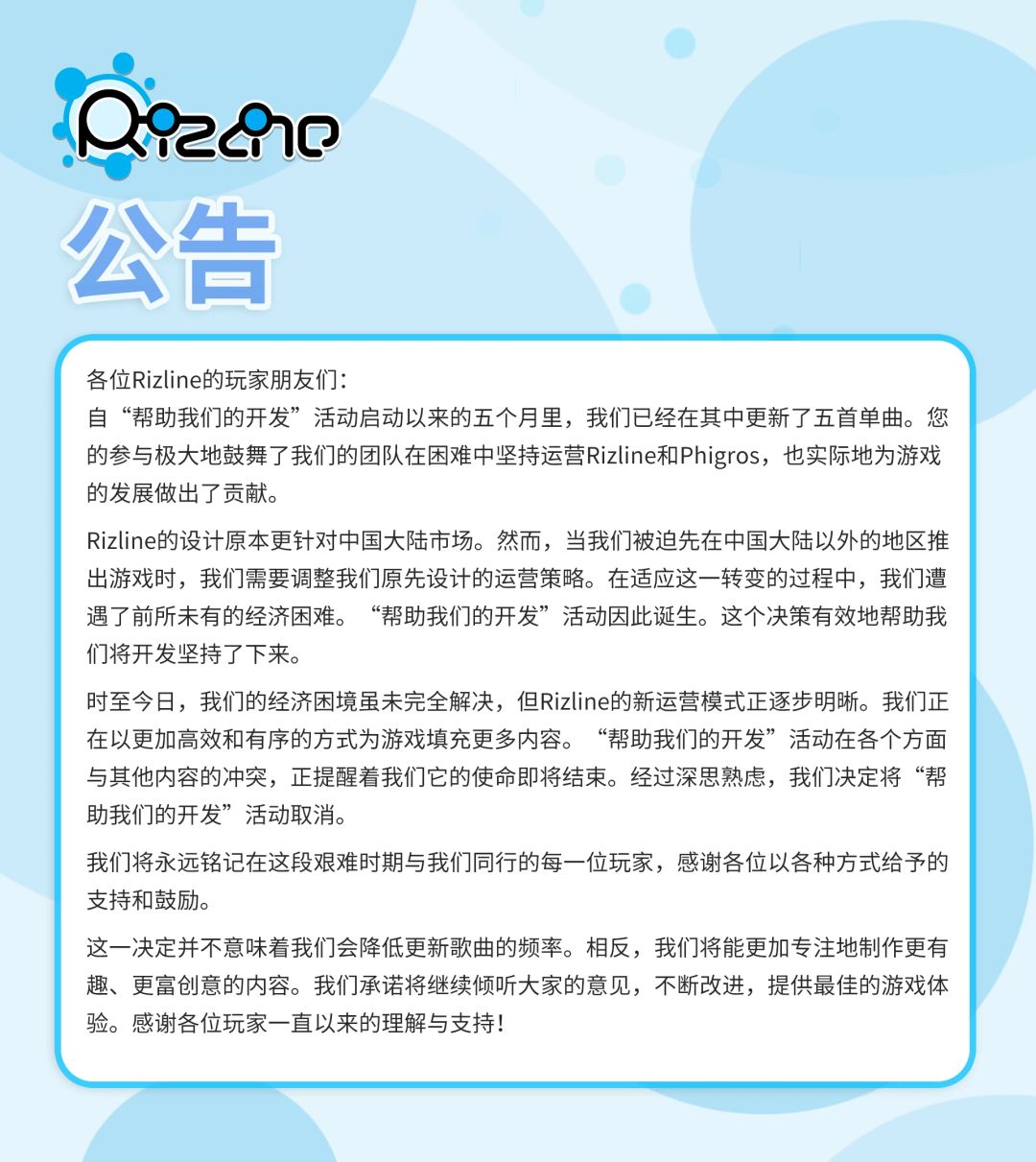Rizline的设计原本更针对中国大陆市场。然而,当我们被迫先在中国大陆以外的地区推出游戏时,我们需要调整我们原先设计的运营策略。在适应这-转变的过程中,我们遭遇了前所未有的经济困难。“帮助我们的开发”活动因此诞生。这个决策有效地帮助我们将开发坚持了下来。