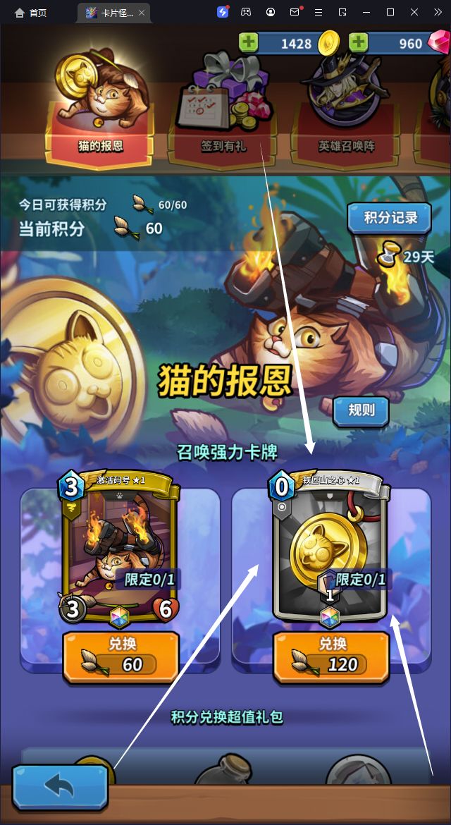 同时活动里有猫的报恩,一定优先换取道具卡铁匠山之心,第二天就可以换。如下图: