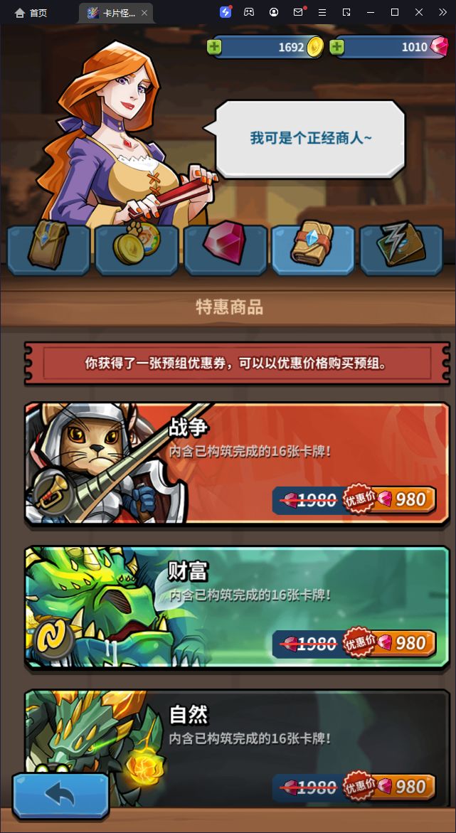 账号5级之后,我们解锁了升级卡牌以及制作卡牌,此时先不着急升级,商店有非常优惠的强力卡组。点击商店寻找活动找到特惠商品,里面有五种卡组可以选择,需要980钻。
