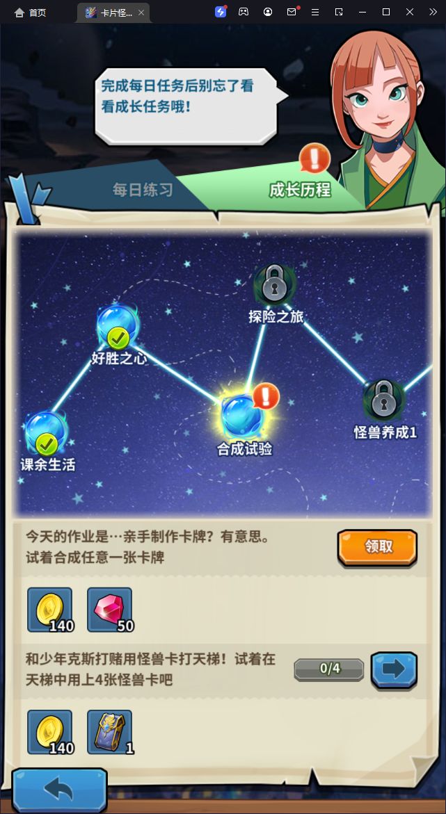 第一种:打开任务,切换至成长历程做完课余生活和好胜之心之后到合成实验内,我们会发现制作一张卡牌完成任务给50钻。