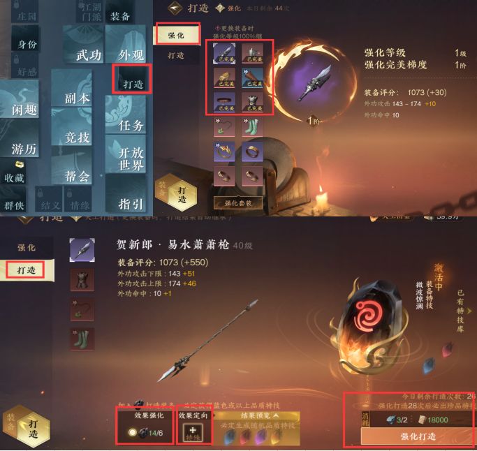 第一天只开启了强化和武器的打造,按照图中流程打造的时候一定要选中效果强化中的陨铁,不然浪费材料,效果定向材料可以用哦~