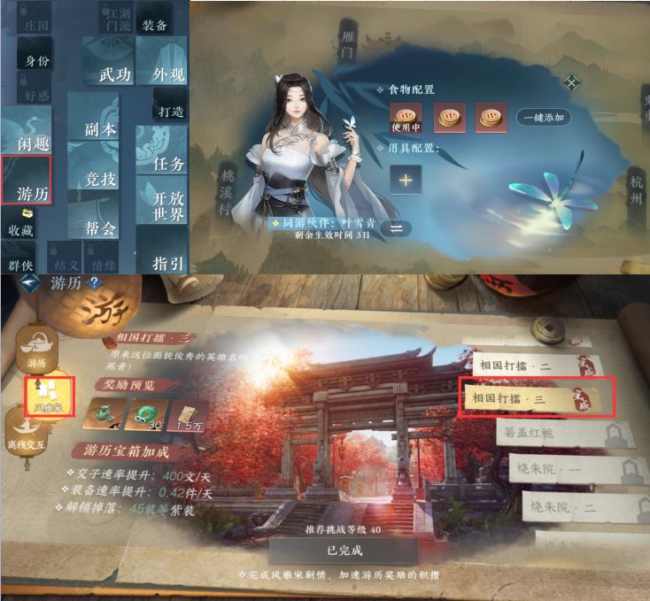游历每天在线不在线都可以获得奖励,地图上的标记点进去可以获得更多奖励,记得通关风雅宋最新关卡哦~