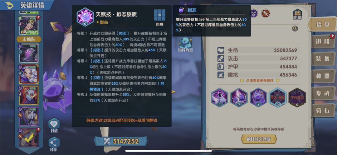 「技能方面」普攻加debuff溶解毒液(被普攻时受到生命上限2%的真实伤害,每次行动后受Curuz攻击力30%的真实伤害),这是此英雄的核心技能,妈妈再也不用担心我打不掉盾了。