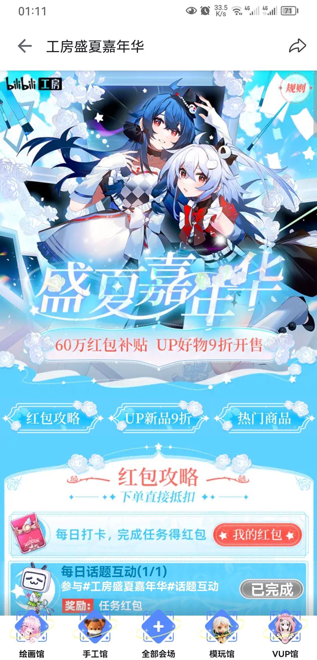 每日做任务拿红包可累计,用于抵扣工房付费物品。(嘛~肯定凑不到几十块让你拿实物周边的啦,但壁纸还是能白嫖的!)(推一下喜欢的画师之二:狗脸脸和袋子,主要是拿原和爱莉希雅的4k壁纸)挺好的,阿B啊!