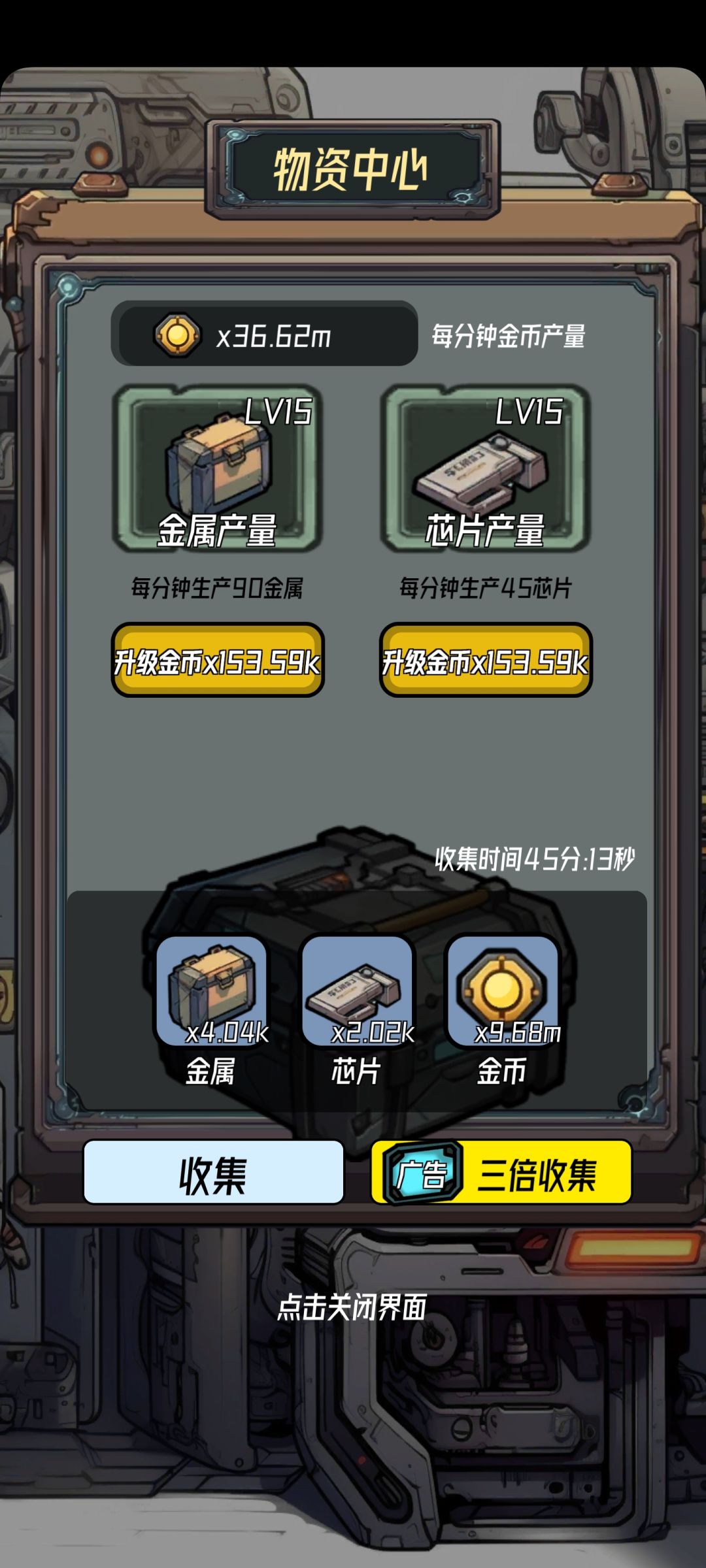 ①开局先刷个好点的初始号,起码得1橙武吧,方便你接下来快速升级物资中心。物质中心尽快升到15级或者30级(后面会提到为啥会是30级),接下来就是卡级不去合成,尽量克制冲动不要去升级,坐等物质中心看视频领取金属和芯片,然后就去开武器、装备、技能箱子,把开到不需要的东西拿去分解掉去强化武器、装备、技能,再去推图。这里要注意下1级的技能强化是最省技能碎片的只需要60碎片强化一级,2级就需要90碎片去强化。