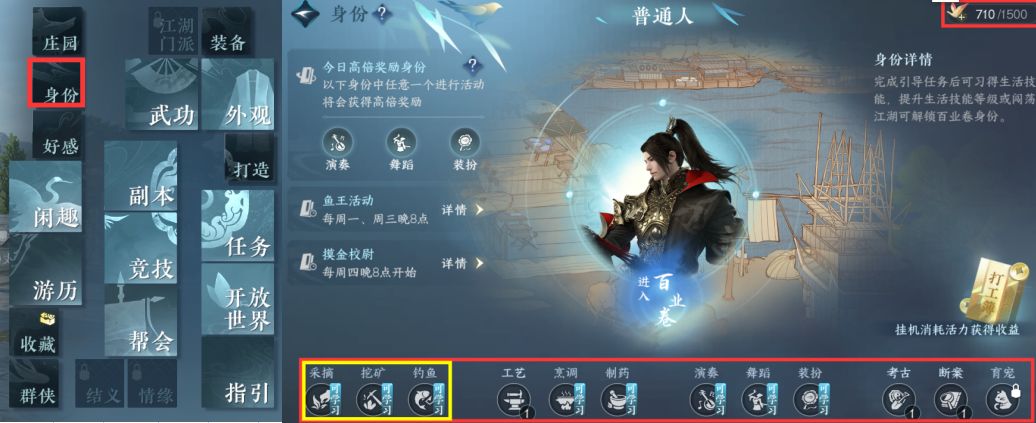 身份玩法相当于副职业,前三个可以获得帮会货运所需的物资,但是个人感觉不划算,尽量精通一种来开展深度挖掘价值,所有职业可以同时选择,买了战令的小伙伴可以直接开启考古之旅,后期内功心法狗粮不用担心!