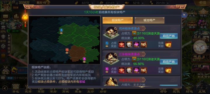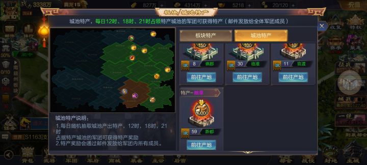 三 18点刷新的特产城就需要配合了,需要特产官配合自己的小号来拿下特产城,小号建立的军团可以有10次弃城机会,这时只需要计算好2边打城速度基本就能拿下,剩余的弃城次数是防止特产刷新再都城,或者是配合不默契导致城池被拿的情况