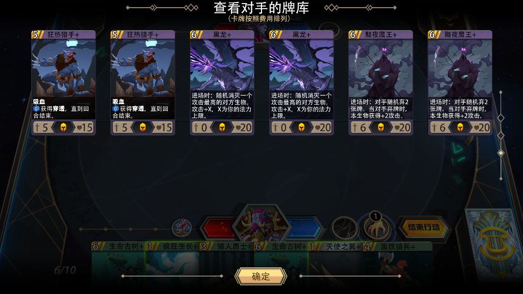 Boss卡组介绍:养高攻注意下6费的黑龙(随机消灭引雾兽等卡牌防御无效),另外该boss开局手牌存在一件固有装备,选卡时最好能打掉