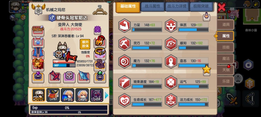 目前属性图,可见确实垃圾,战力还是堆垃圾力量套薅的一点,吞完血量120万,战力也就七十万上下。旅团高级研究生命加成满