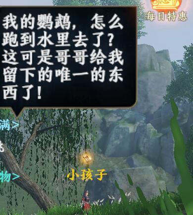 这个隐藏任务的坐标在无量山辕门坝下面那个村的村口,看见这个小孩子的时候,你就跑到她面前去和她对话,我说的是“我来帮你”,然后在她面前站一会,任务就触发了, 可以看到触发后,这个小孩子头顶上有任务的图标,包括你的任务栏里面会有隐藏任务“爱屋及乌”的信息。