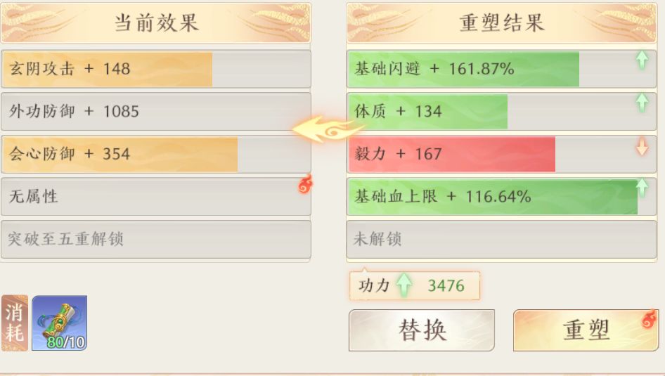 每个不同的词条,对于人物功力的提升也是不同的,这里推荐大家选择适合自己人物门派的重塑属性,比如我们在打修炼的时候,一般别人不会看你功力多少,而是直接看你人物的攻击是多少,这个人物的攻击数值,就是在重塑这里拉开差距的。