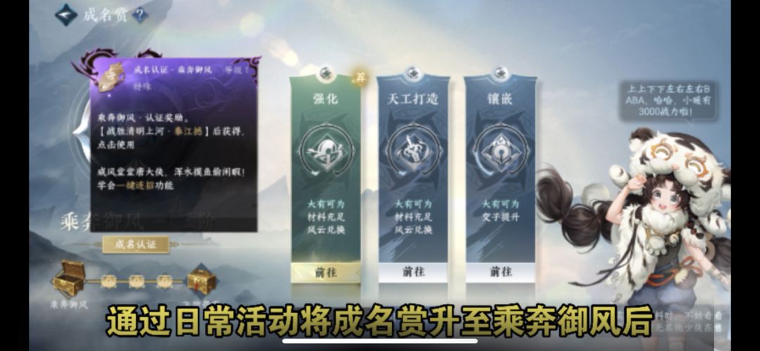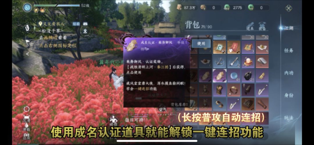 通过日常活动将成名赏升至乘奔御风后-使用成名认证道具就能解锁一键连招功能(长按普攻自动连招)-可以在技能面板自由打开或关闭