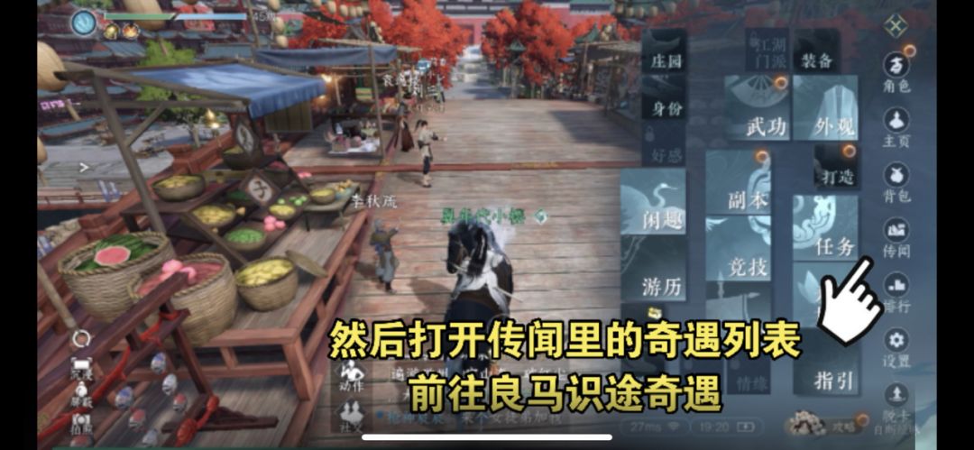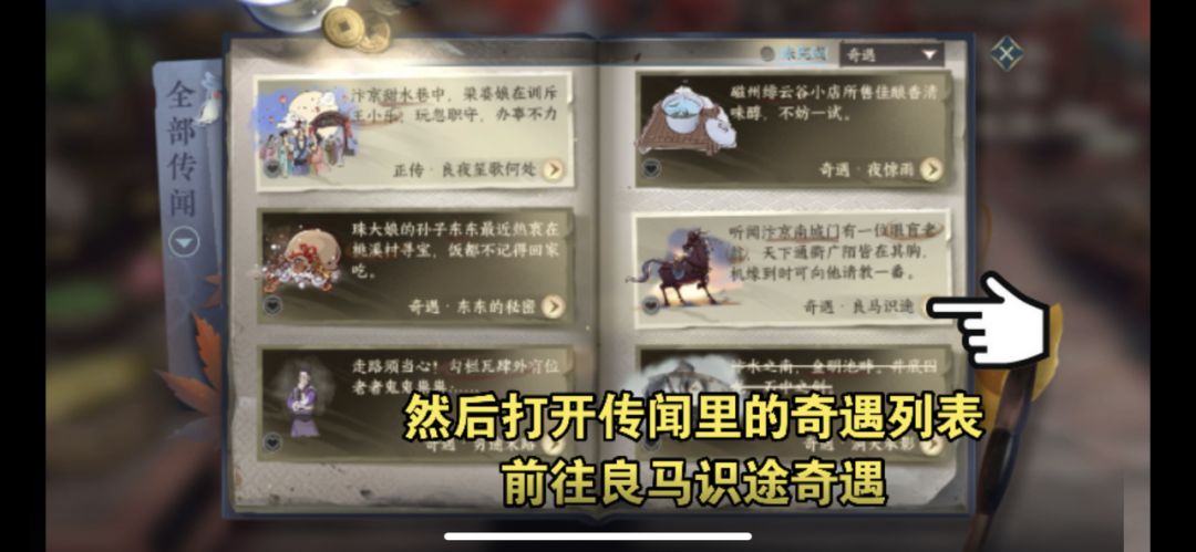建议先服用千里目穷丹增加奇遇概率-然后打开传闻里的奇遇列表,前往良马识途奇遇