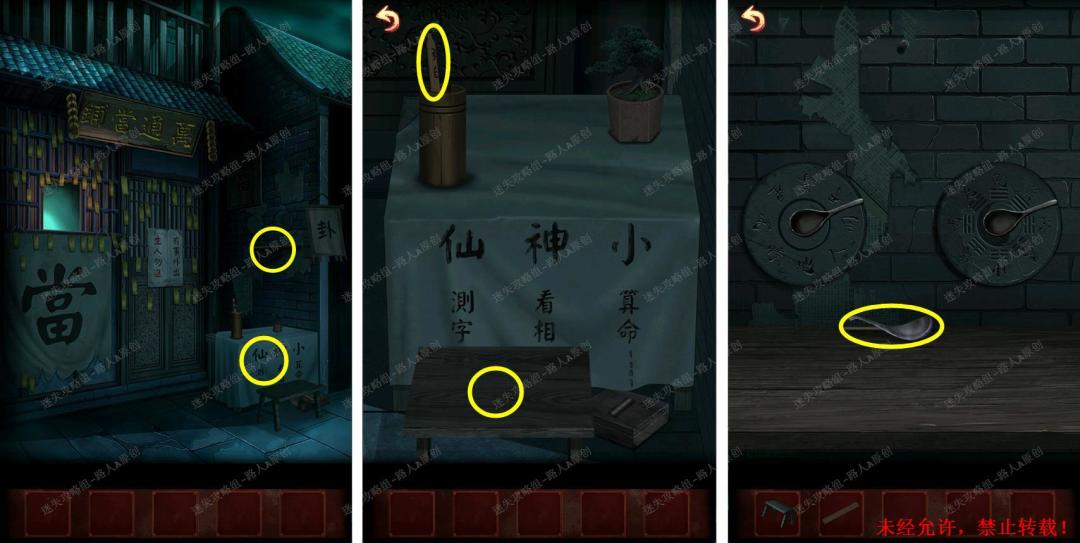 52.根据线索,将【卦象解析】和【金钱剑图画】放在卦摊旁的罗盘。52.1、52.2