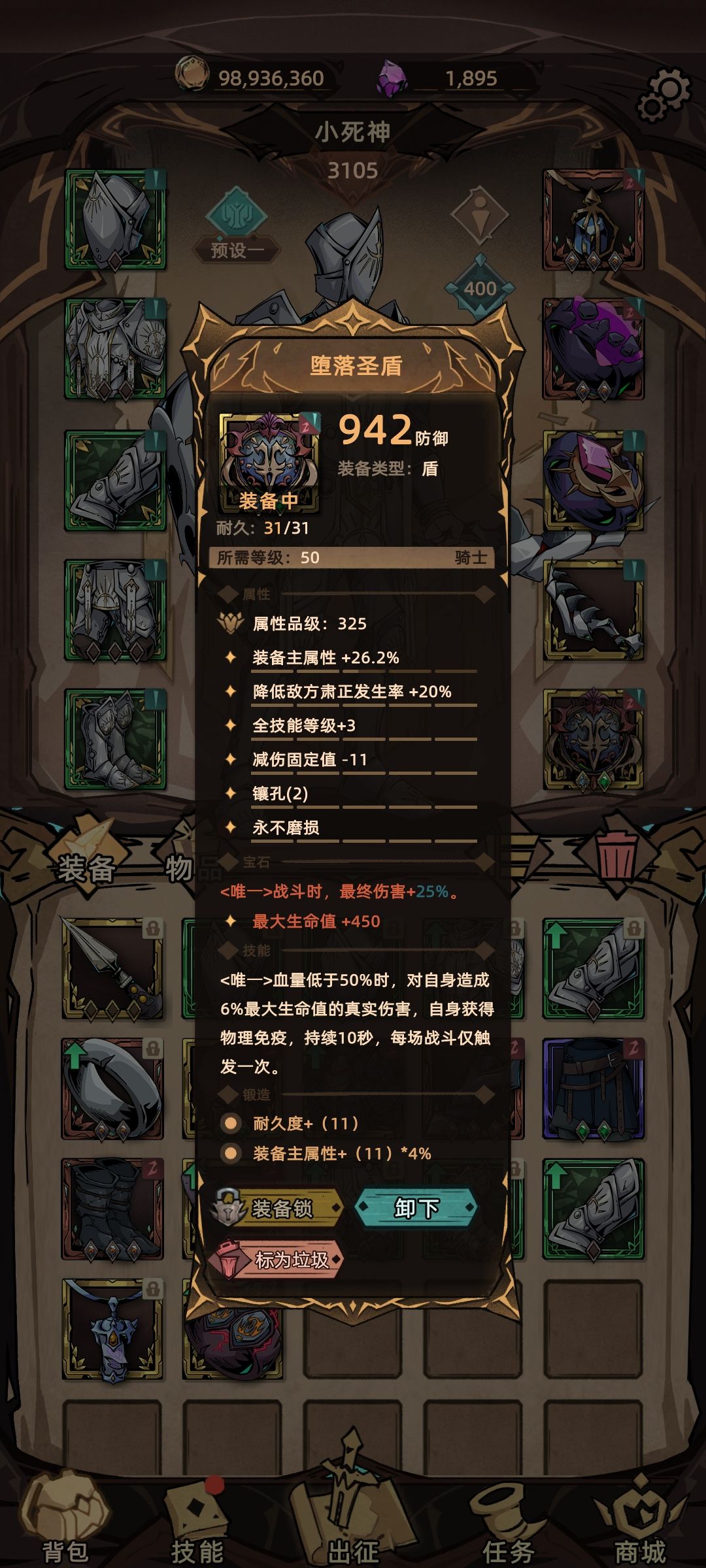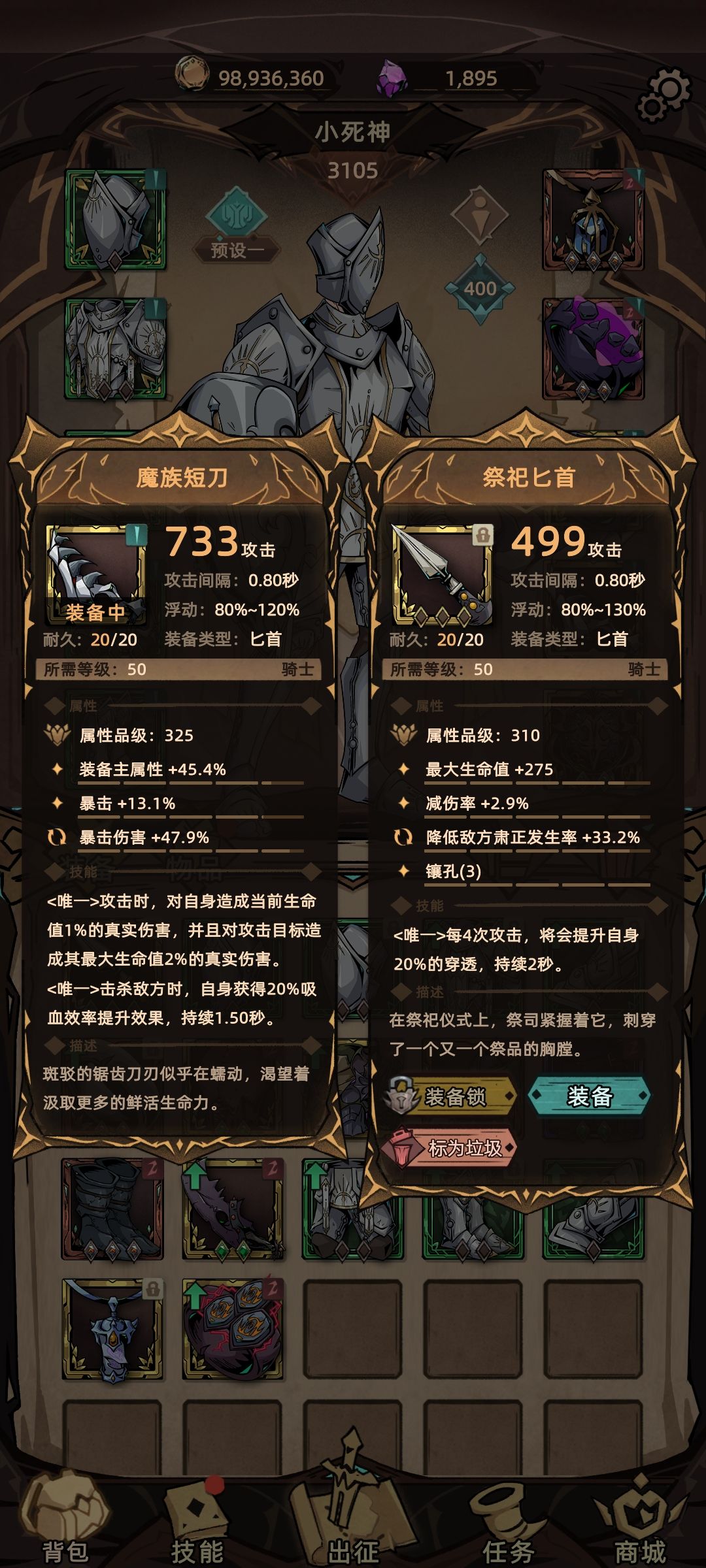 武器:【魔族短刀】属性加暴击率和暴击伤害,攻击时也能触发受击效果;【祭祀匕首】属性加降低肃正率,有孔,强化词条加155%的暴击伤害。武器用匕首也能更频繁触发<碎盾裂击>。