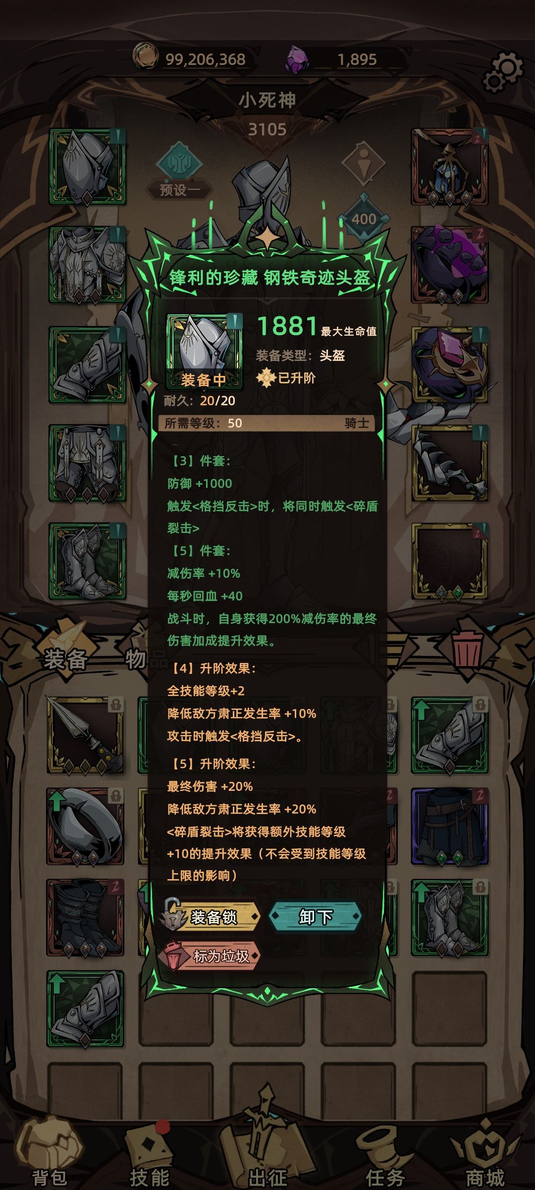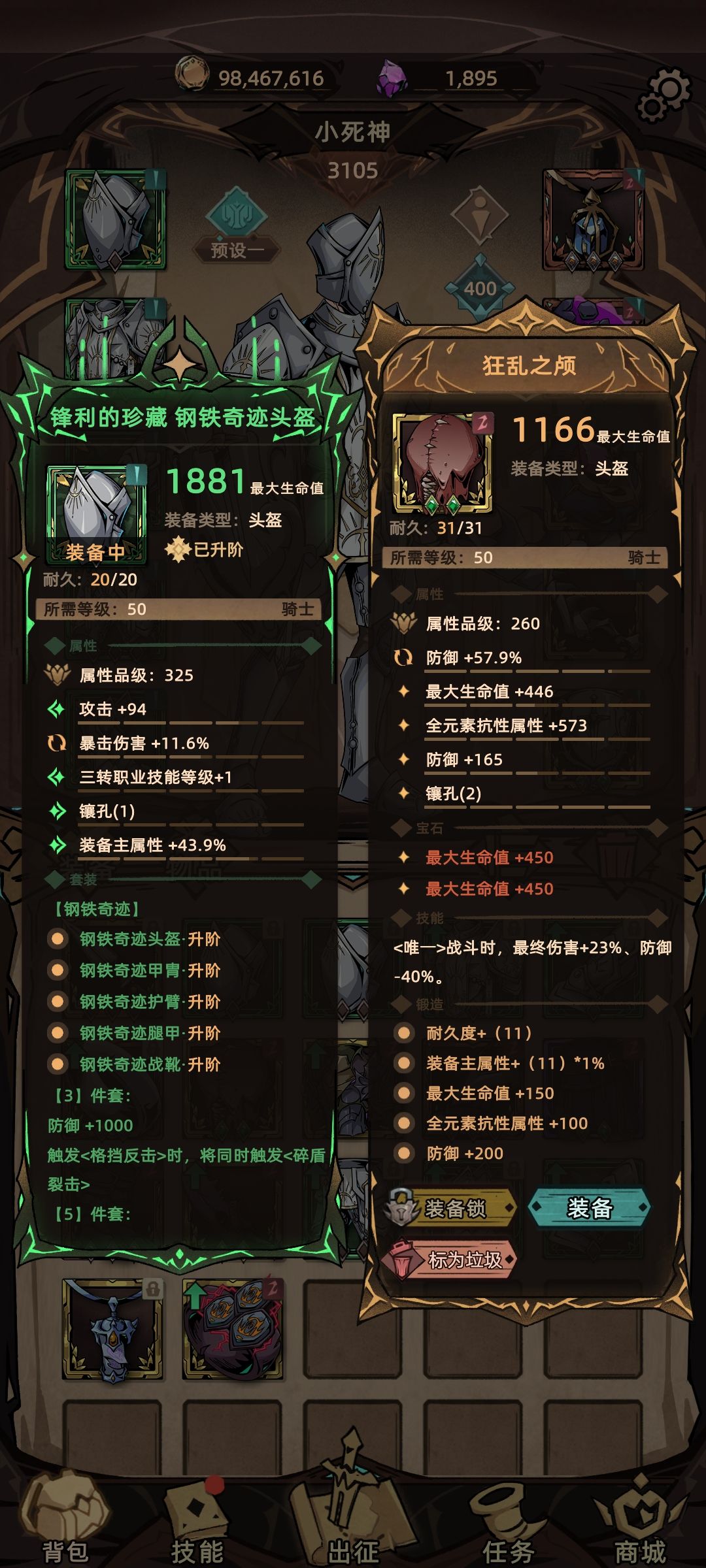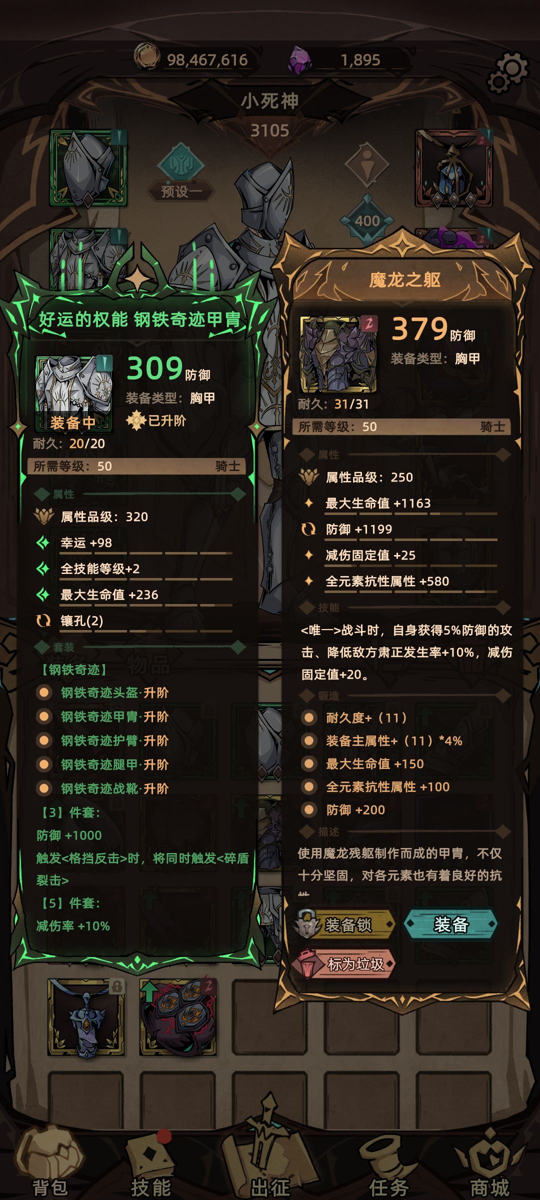 套装需求-1后装备替换,如果技能等级不够,优先替换头盔为【荆棘冠冕】,这个装备可以加5的全技能等级;如果技能等级足够,则优先替换胸甲为【魔龙之躯】,属性最高加1200的基础防御力。次之替换头盔为【狂乱之颅】,加百分比防御力和23%的最终伤害,有孔。