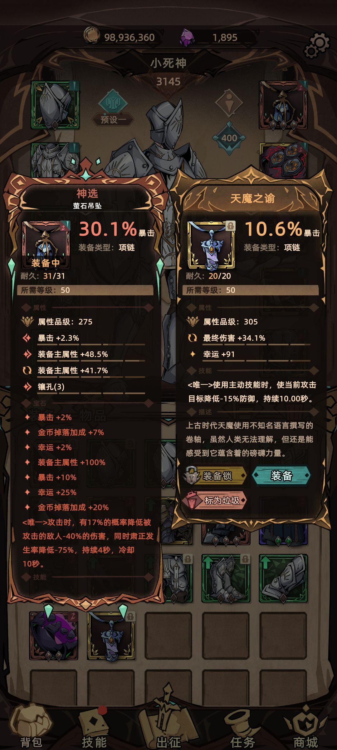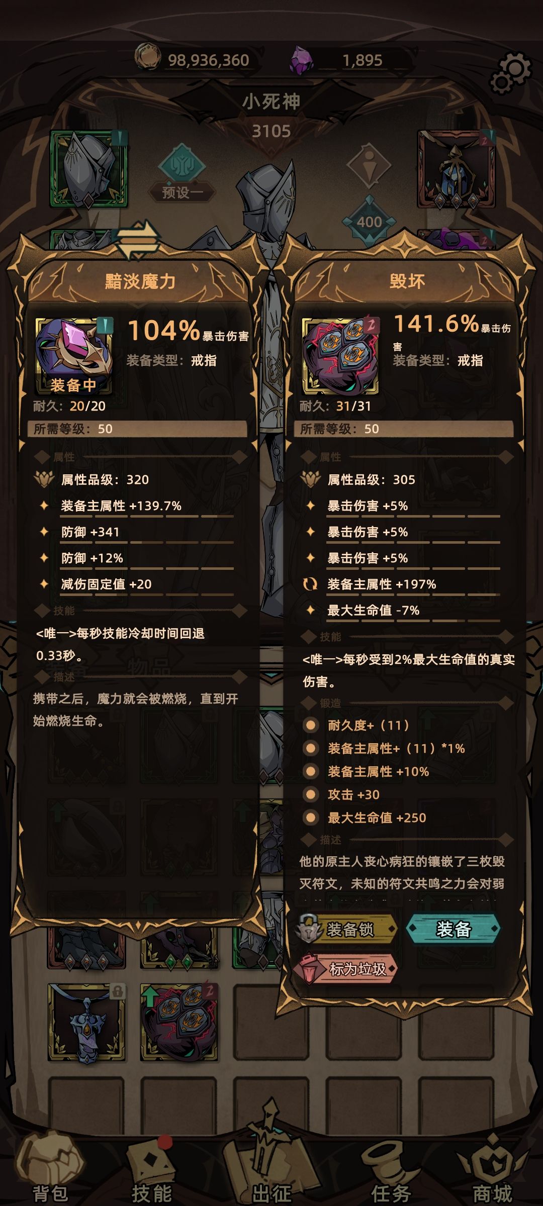 暴击伤害方面:就戒指加了,神器戒指必要主属性提升,另一个戒指用【毁坏】或者【黯淡魔力】。项链用主属性提升的【神选】保证暴击率足够