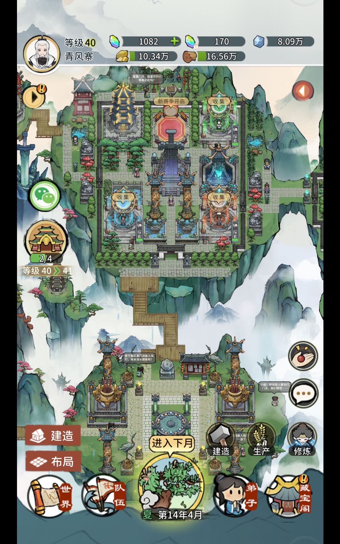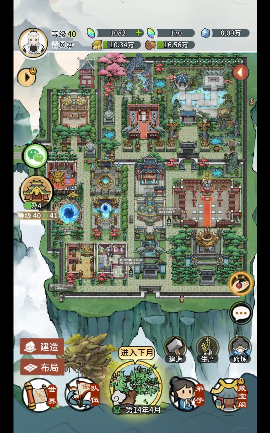 分享一下参考B站上云中君视频做的布局,感觉不足的地方就是每次进游戏都会去到祖师殿(而我把它排在了右上角),后面有新建筑的话可以把炉鼎换下来
