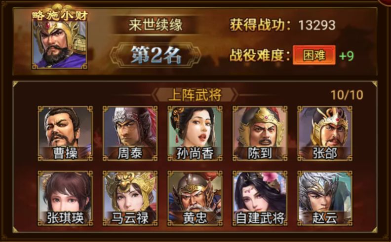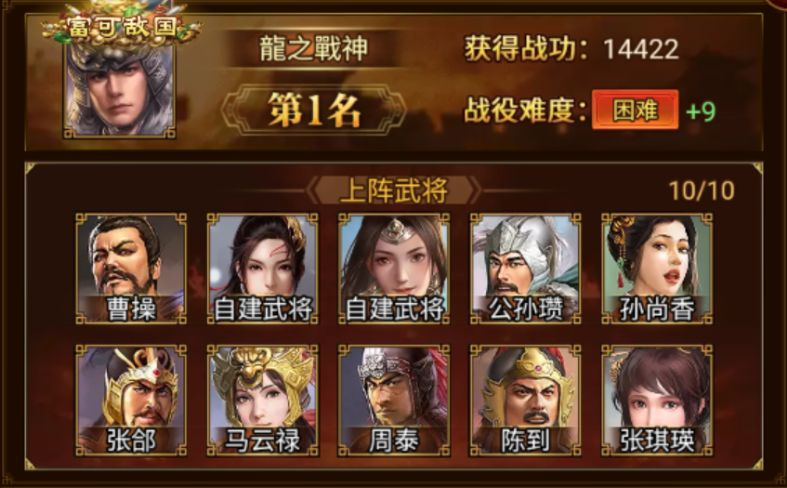成功荣登本期下邳之战榜首的是 龍之戰神 军团,成功攻破 困难+9。