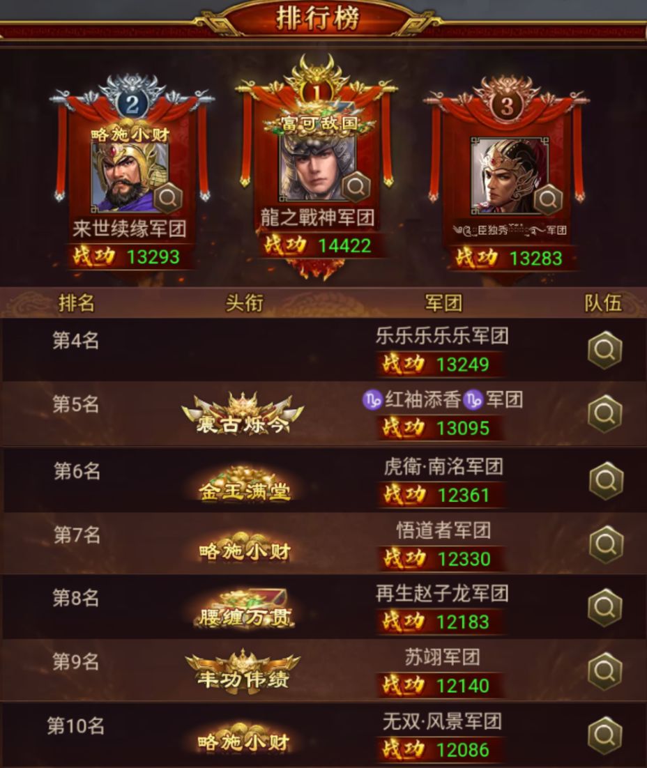 在本期下邳之战中荣登TOP10的勇士们依次是:龍之戰神、来世续缘、臣独秀