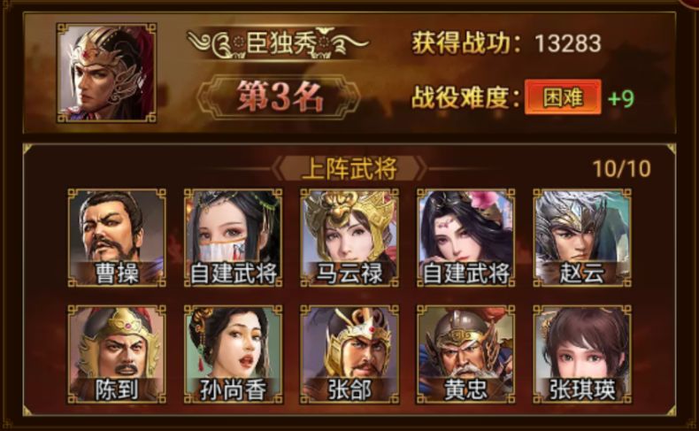 赢得第三位的是 臣独秀 军团,成功攻破 困难+9。