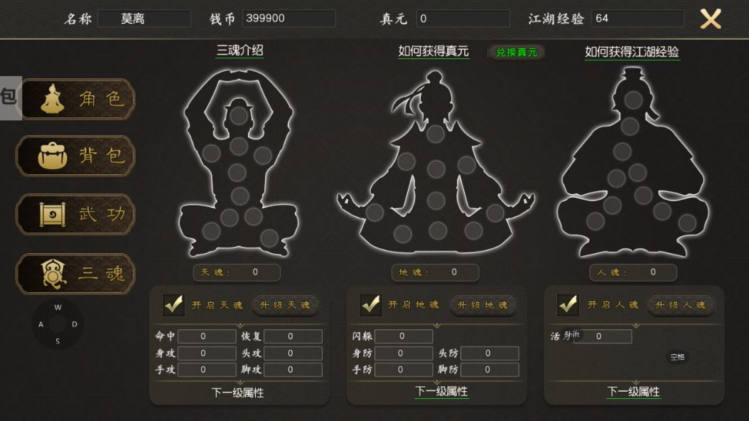 打开背包,进入眼帘的便是最下面的三魂系统了。打开之后就有人要问了,这个三魂的真元和江湖经验应该怎么弄?先说说真元吧,真元需要我们用满级武功去兑换,换完之后,武功消失。不过因为最好是在刚开始前七天这样做,因为首冲的几把练级武器再吃双倍经验丹,练满武功真的很快