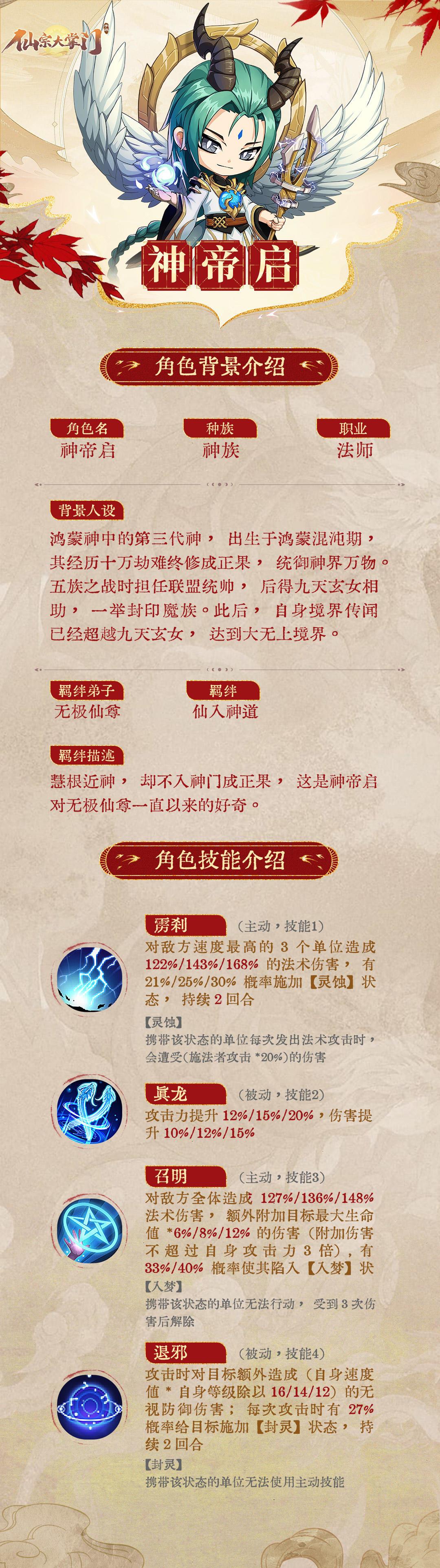 神帝启被不少掌门誉为最强法师,甚至输出可无视防御,今天小师妹就给大家带来有关他的神将图鉴。
