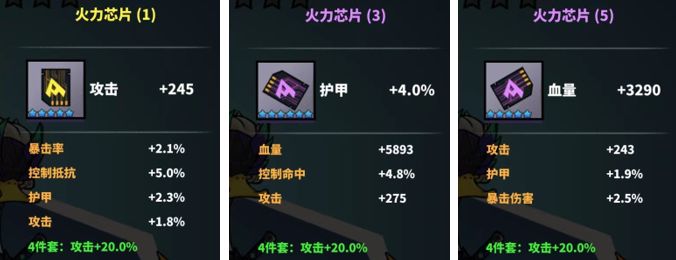 1、3、5号位的芯片副属性基本上都可以随出来刚刚提到的8个属性类型,不过因为1、3、5号位的主属性类型是固定的,所以1号位的副属性不会出现攻击+属性,3号位的副属性不会出现护甲%属性,5号位的属性不会出现血量+属性。