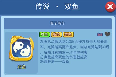 双鱼骰子是一枚攻击骰子,其总点数到达5之后会提升攻击力和暴击率,并且点数越高提升越大;当总点数到达30后,每隔几秒就可与触发一次全屏伤害。