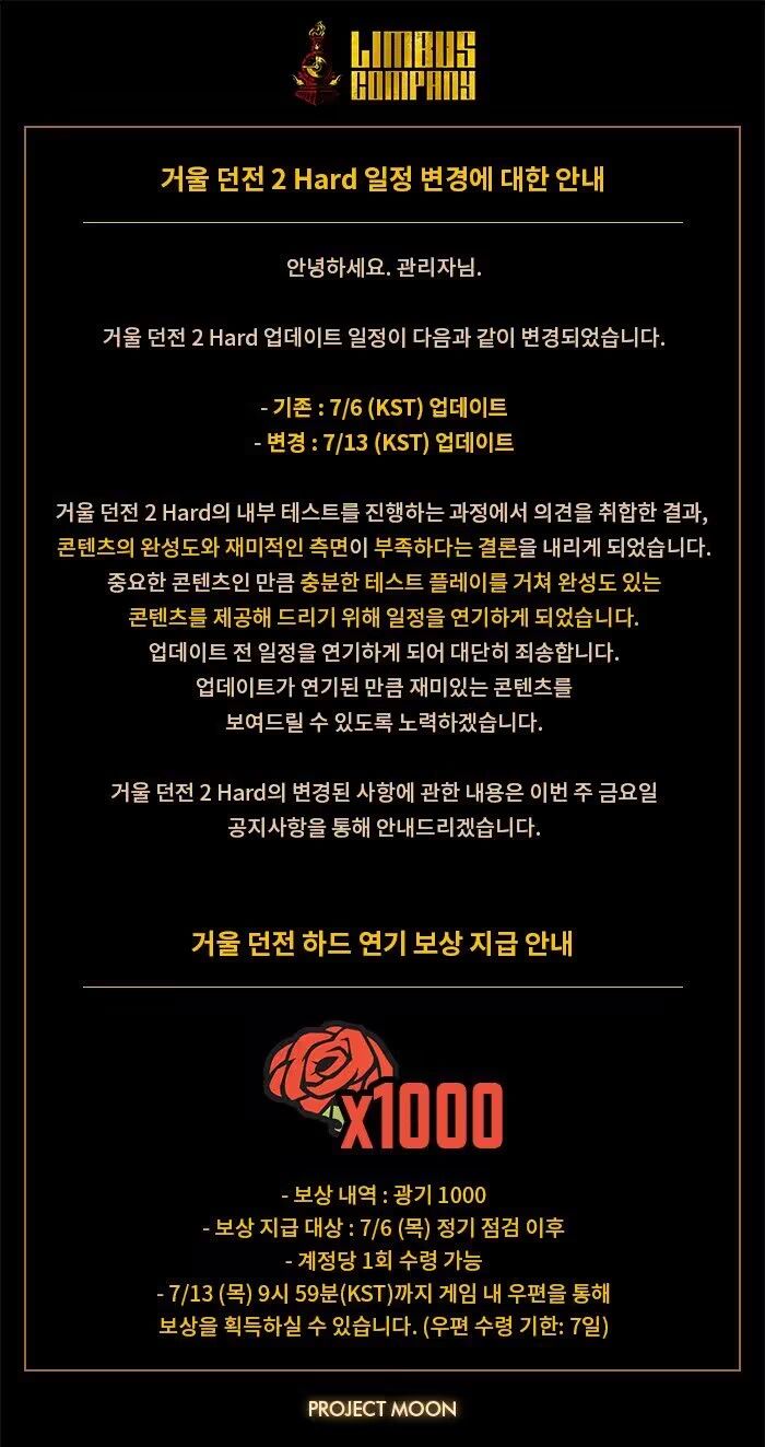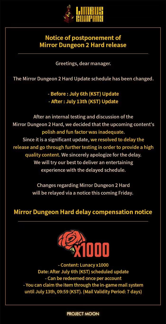 在进行[镜像迷宫2 困难难度]的测试与讨论中我们接收了一部分建议与反馈,最终我们得出了完成度与趣味性不足的结论。因为这是十分重要的游戏模式,所以为进行充分测试从而提供更为完善的游玩体验,我们决定推迟更新日程。在临近更新时推迟日程,我们感到非常抱歉。作为弥补,为呈现更为精彩的新模式,我们将一定会竭尽所能。关于镜像迷宫2困难模式的变更事项,将会于本周五通过公告进行通知。