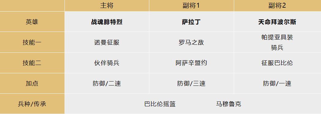 该阵容以流血效果为核心,战魂腓特烈携带【诺曼征服】和【伙伴骑兵】可以提供高额的连击,天命拜波尔斯可以提高友军突击技能发动概率,从而实现突击技能和流血技能的高频率释放,快速地为敌军叠加流血效果,不断地造成真实伤害。【征服巴比伦】可以为队伍提供高额的减伤,提高队伍整体强度。