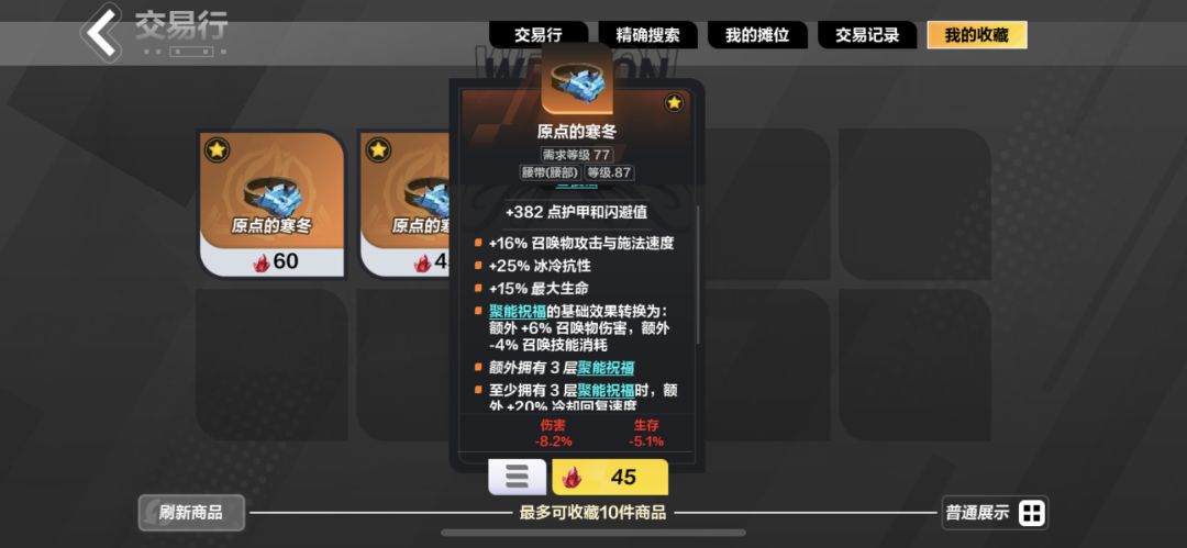 2 衣服无限要塞 召唤上限一定要选+1的 其次额外伤害越高越好 成本15火(装备等级选择≥80级)3 项链月华护符 主要拿等级 4火 4 手部大贤者的长手套,主要补生存抗性5 腰带原点的寒冬 核心是20冷却加成,注意下边至少拥有一定要和额外拥有持平或者更低低 成本45火6 鞋子选用心灵灌注4火 7 戒指 主要补全抗性两个4火 8 武器 临别索求 30火左右 副手盾牌 懦者的选择 2火左右