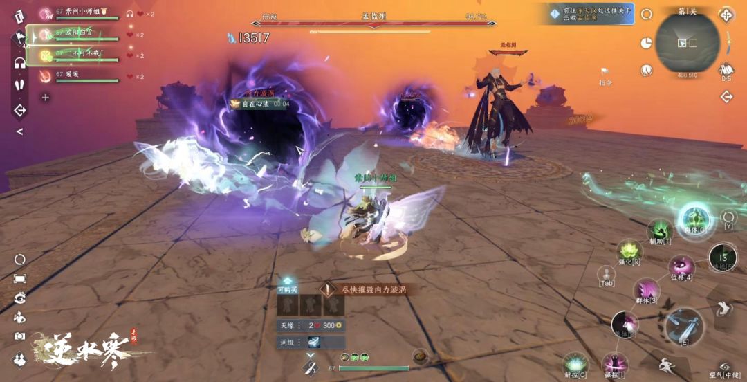 第一阶段——平台碎裂前,灭团点是内力漩涡,四周会周期性出现黑洞,需要第一时间集火一个黑洞,并远离其余2个黑洞;