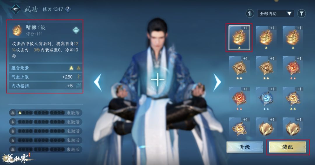在右侧选中内功后,左侧会显示此内功的具体信息(特性、属性、元素),点击装配按钮可以装配此内功。