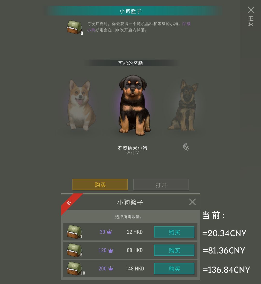 获取方式相当简单,只要20块,就能有几率获得一只随机等级的随机的狗狗(额.....真的有人买吗?)