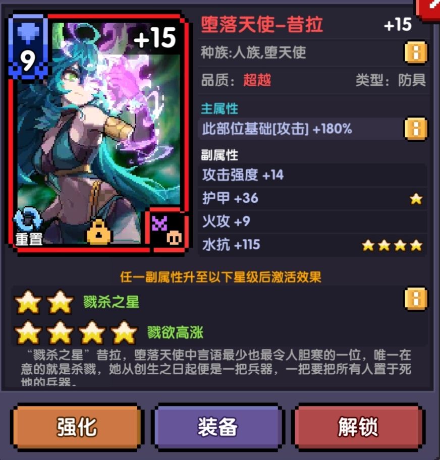 ⭐⭐⭐⭐:堕天使印记为一时,提供240元素穿透;堕天使印记为二时,提供14%技能伤害和28%普攻伤害;堕天使印记为三时,提供300点护甲穿透(根据堕天使印记数量选择效果,只能存在一个效果)