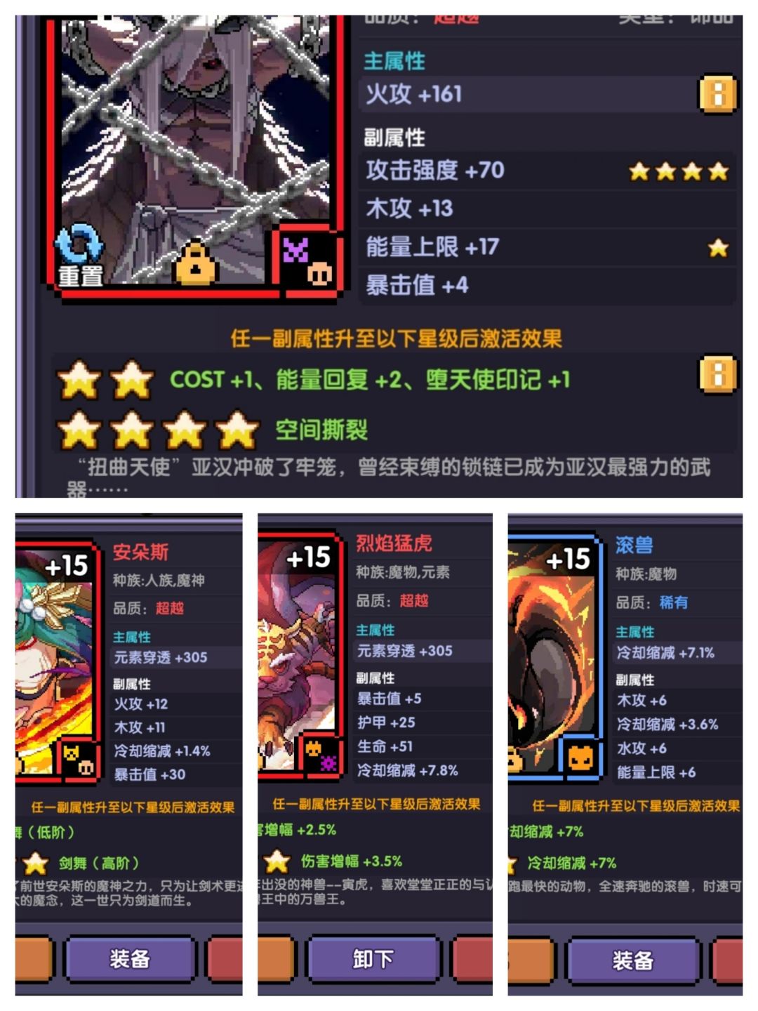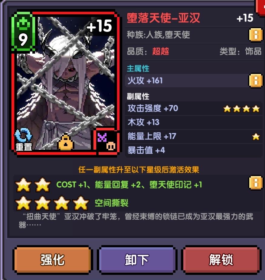 提示:官方从亚汉开始引入堕天使印记机制(堕天使印记本身不能拿来凑羁绊),该机制连通着亚汉、撒斯姆、凡尼、伊马四张堕天使魂卡。其中撒斯姆和亚汉的四星效果都带有属性三选一的效果,二者的四星效果提供的三条加成不能全部吃到,只能根据印记数量三选一。