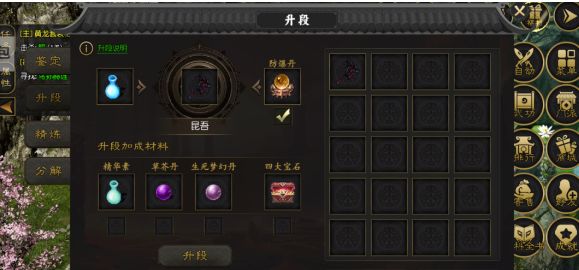 在升段之前,玩家需要确定自己需要升级哪个装备,并选择需要的升段材料。升段材料可以商城购买 ,也可以在副本和任务打怪获取。若想提高升段的成功率,可以在商城购买精华素、草芥丹、生死梦幻丹和四大宝石。此外,还需要准备防爆丹,这个是防止装备升段失败后,装备碎掉的药品,这个在商城可以买到。三、升段技巧