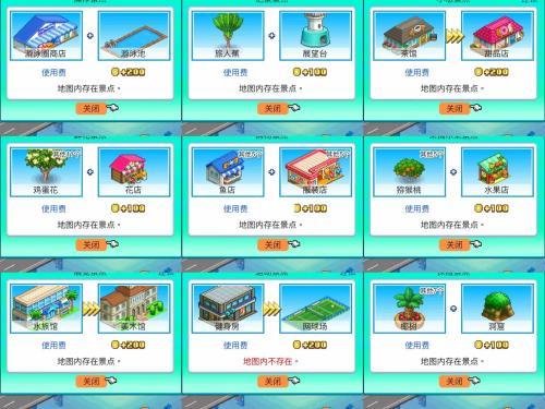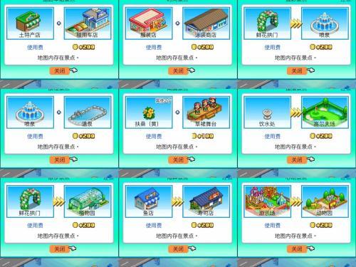 图2-6 连频景点:需要解锁后面的建筑必须要先建造前面的建筑后才能解锁并建造后面的减租如商店要+树木/花才会发挥该建筑的最大作用,建造遮阳椅需要先建造果汁站。